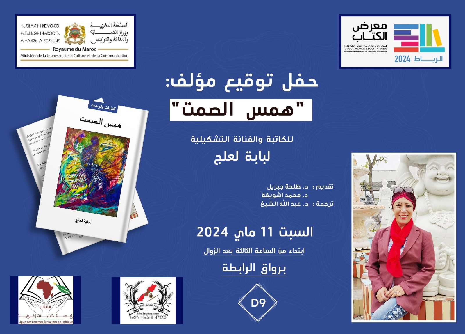 يستضيف المعرض الدولي للنشر والكتاب في دورته 29 بالرباط، الكاتبة والفنانة التشكيلية لبابة لعلج، وذلك يوم السبت 11 ماي 2024, بدءا من الثالثة زوالا برواق رابطة كاتبات المغرب، في حفل توقيع مؤلفها “همس الصمت”.