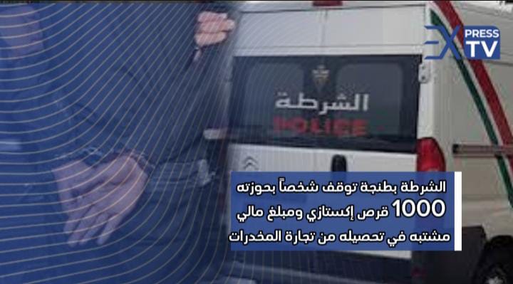 تمكنات الشرطة بمدينة طنجة من توقيف شخص يشتبه في تورطه فقضية كتعلق بالحيازة وترويج المخدرات بجميع أنواعها في حالة تلبس بحوزته 1000 قرص من نوع اكستازي،بواسطة دراجة نارية ،تم ظبط بحوزته أيضا مبلغ من المال كيتشتبه في أنه من تحصيل التجارة.