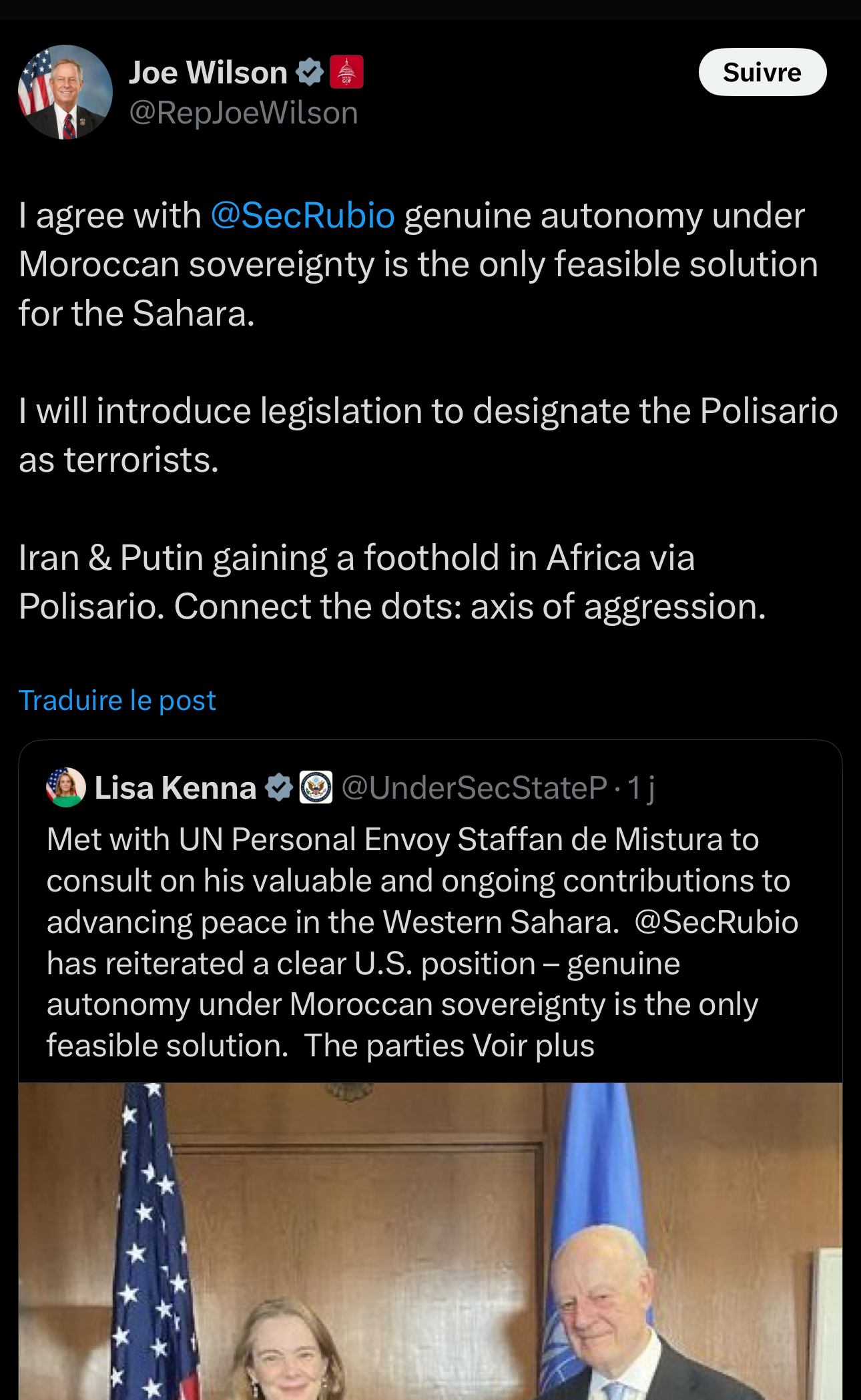 وقال ويلسون، في تغريدة نشرها على منصة “إكس” تويتر سابقا، إنه يتقاطع مع موقف السيناتور ماركو روبيو بخصوص وجاهة المبادرة المغربية للحكم الذاتي، معتبرا إياها “الحل الوحيد القابل للتطبيق في تسوية النزاع، قبل أن يضيف محذرا: “إيران وكوبا وفلاديمير بوتين ينشطان في المنطقة دعما للبوليساريو بغرض ضرب استقرار المملكة التي تحظى بدعم الرئيس دونالد ترامب الذي لطالما اعترف بسيادة المغرب على صحرائه.