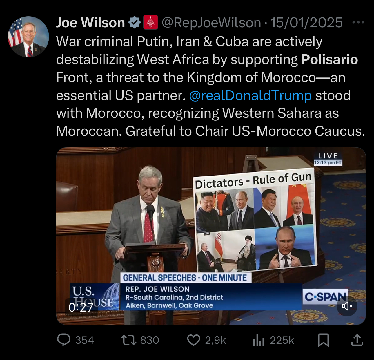 أعلن النائب الجمهوري جو ويلسون تقديم مشروع قانون أمام الكونغرس الأمريكي، لتصنيف ميليشيا البوليساريو، المدعومة من نظام العسكر في الجزائر، كمنظمة إرهابية، محذراً كذلك من نشاط إيران وروسيا وكوبا الداعمين للمرتزقة في المنطقة.