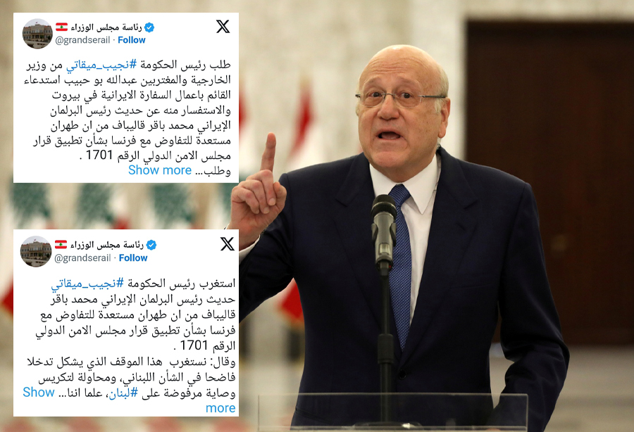 صدر رئيس حكومة تصريف الأعمال اللبنانية، نجيب ميقاتي، عبر تدوينة على منصة “إكس” (تويتر سابقًا)، بيانًا استنكر فيه تصريحات رئيس البرلمان الإيراني، محمد باقر قاليباف، حول استعداد طهران للتفاوض مع فرنسا بشأن تطبيق القرار الأممي 1701. واعتبر ميقاتي هذه التصريحات محاولة لفرض وصاية غير مقبولة على لبنان، مشيرًا إلى أن الدولة اللبنانية وحدها هي المخولة بالتفاوض بشأن هذا القرار.