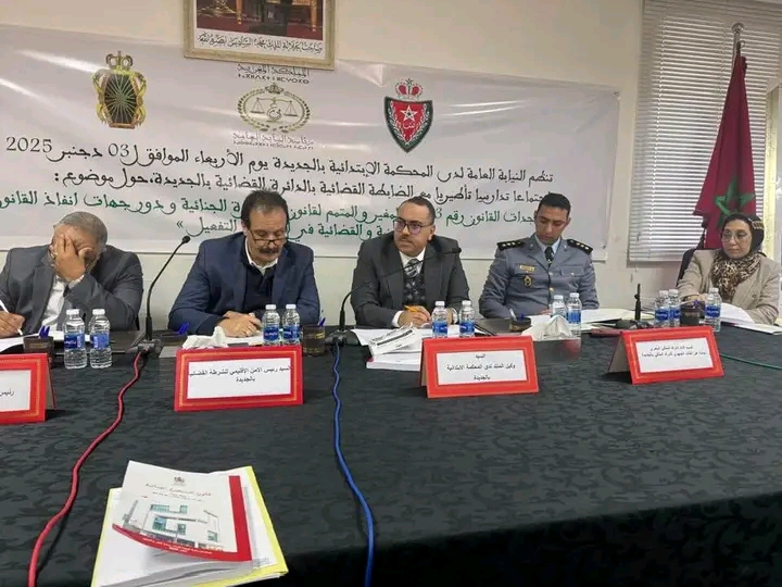 نظمت النيابة العامة لدى المحكمة الابتدائية بالجديدة، يوم أمس 3 دجنبر 2025، اجتماعا تأطيريا مع ضباط الشرطة القضائية بالدائرة القضائية، تفعيلا لتعليمات رئاسة النيابة العامة بشأن تعميم مضامين المنشور المتعلق بمستجدات القانون رقم 03.23 المغير والمتمم لقانون المسطرة الجنائية، والذي سيدخل حيز التنفيذ يوم 8 دجنبر 2025.