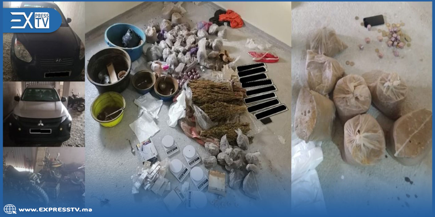 وقد أسفرت عملية التفتيش المنجزة بداخل منزل يستغله المشتبه فيهم عن حجز 52 كيلوغراما من مخدر الحشيش وثلاثة كيلوغرامات من مخدر الكيف، علاوة على حجز ثلاث سيارات ودراجتين ناريتين وثمانية لوحات ترقيم مزورة ومبلغ مالي يشتبه في كونه من متحصلات هذا النشاط الإجرامي.