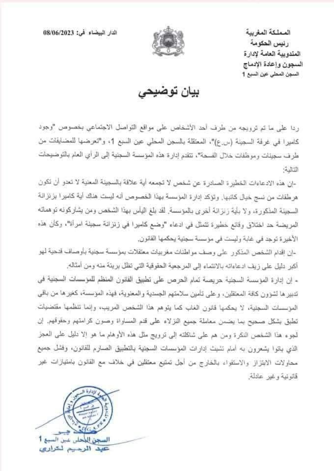إدارة السجن المحلي عين السبع 1 تنفي ما تم ترويجه بشأن “وجود كاميرا في غرفة السجينة (س.ع)” (بيان توضيحي)