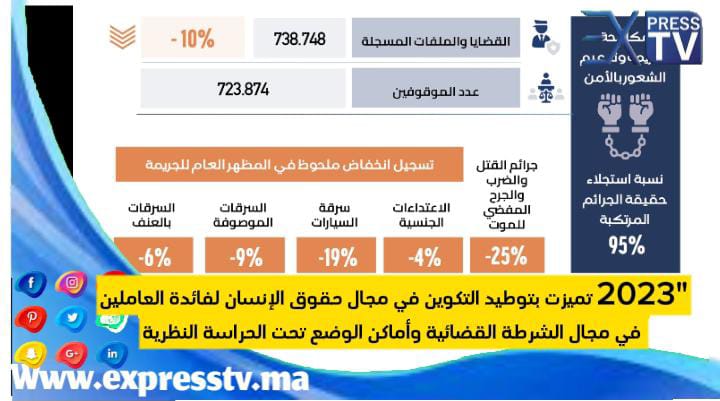 وأشار البلاغ إلى أنه في مقابل انخفاض مؤشرات الجريمة، شهدت سنة 2023 استمرار معدل الزجر، وهو نسبة استجلاء حقيقة الجرائم المرتكبة، في تسجيل مستويات قياسية للسنة السابعة على التوالي، إذ ناهز 95 بالمائة في إجمالي القضايا المسجلة، وحوالي 92 بالمائة في الجرائم العنيفة، وهي معدلات نوعية وقياسية ساهم فيها بشكل أساسي تطوير آليات البحث الجنائي، وتكريس الدور المحوري للشرطة العلمية والتقنية في الأبحاث المنجزة، فضلا عن التبليغ الفوري للضحايا والشهود عن الجرائم المرتكبة، وكذا التعاطي الجدي مع الوشايات الافتراضية والمحتويات المنشورة على وسائط التواصل الحديثة، وهو ما ساهم بشكل كبير في التقليص من مؤشرات «جرائم الظل أو الجرائم غير المبلغ عنها» ومكن بالمقابل من زجر المتورطين في ارتكابها.