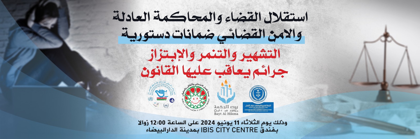 سيكون سكان مدينة الدار البيضاء على موعد يوم الثلاثاء المقبل، مع ندوة صحافية مشتركة بين انشط الجمعيات الحقوقية والاعلامية على الصعيد الوطني، كجمعية بيت الحكمة، وجمعية بسمة، والرابطة المغربية للمواطنة وحقوق الانسان، والمرصد الدولي للإعلام وحقوق الانسان، حول موضوع “استقلال القضاء والمحاكمة العادلة: الحقوق الدستورية، التشهير ونشر خطاب الكراهية والتنمر بالمؤسسات والاشخاص والشكايات الكيدية، جرائم يعاقب عليها القانون“.
