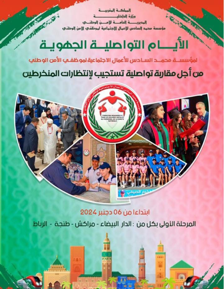 تنظم مؤسسة محمد السادس للأعمال الاجتماعية لموظفي الأمن الوطني، أيام 6 و7 و8 دجنبر الجاري، النسخة الأولى للأيام التواصلية للقرب لفائدة منخرطي المؤسسة من موظفي الأمن الوطني الممارسين والمتقاعدين وكذا أبنائهم وباقي ذوي حقوقهم، وذلك بفضاء خاص تم تجهيزه بالقاعة متعددة الرياضات محمد مجيد بمدينة الدار البيضاء.
