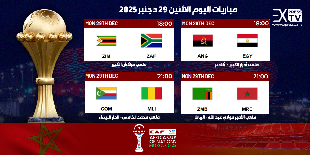 تنطلق اليوم الاثنين 29 ديسمبر 2025، عدد من مباريات الجولة الثالثة من دور المجموعات في كأس أمم إفريقيا 2025 المقامة حاليا في المغرب، وسط متابعة جماهيرية واسعة وترقب لنتائج حاسمة تُحدّد بقاء أو خروج منتخبات من المنافسة.